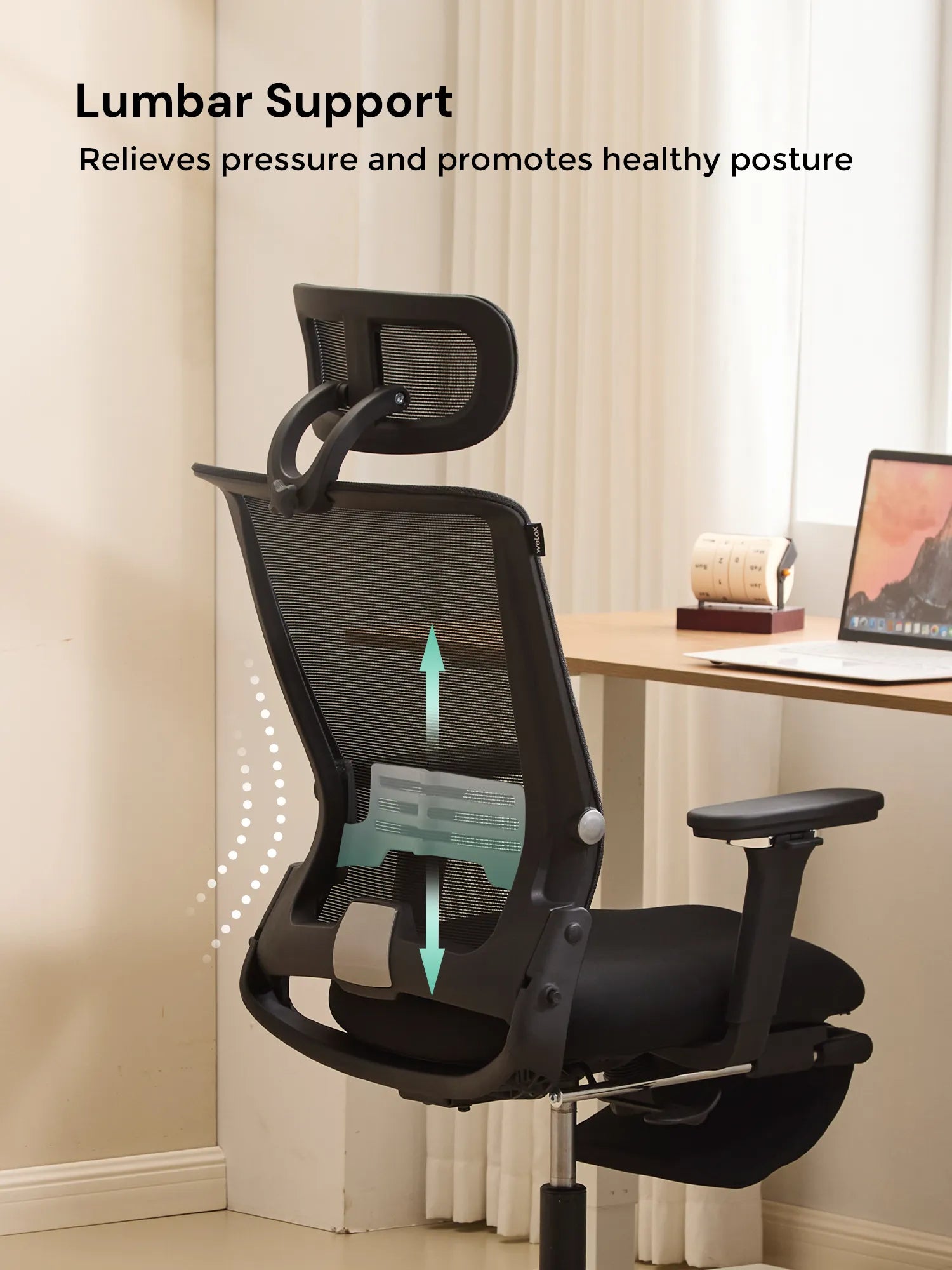 S-shaped backrest: follows the spine curve, supports the lower back, and reduces fatigue. Adjustable lumbar support: helps maintain healthy posture.