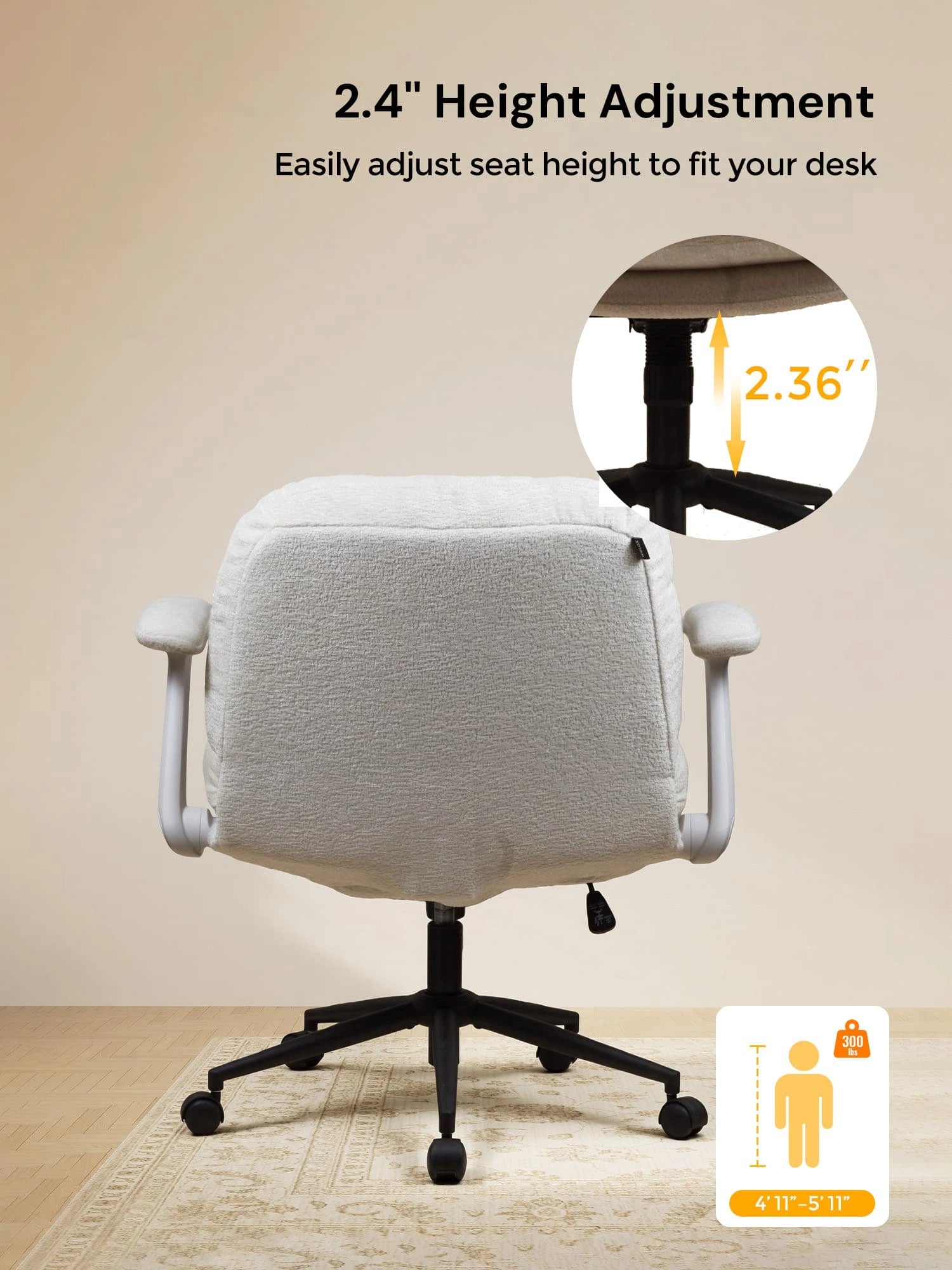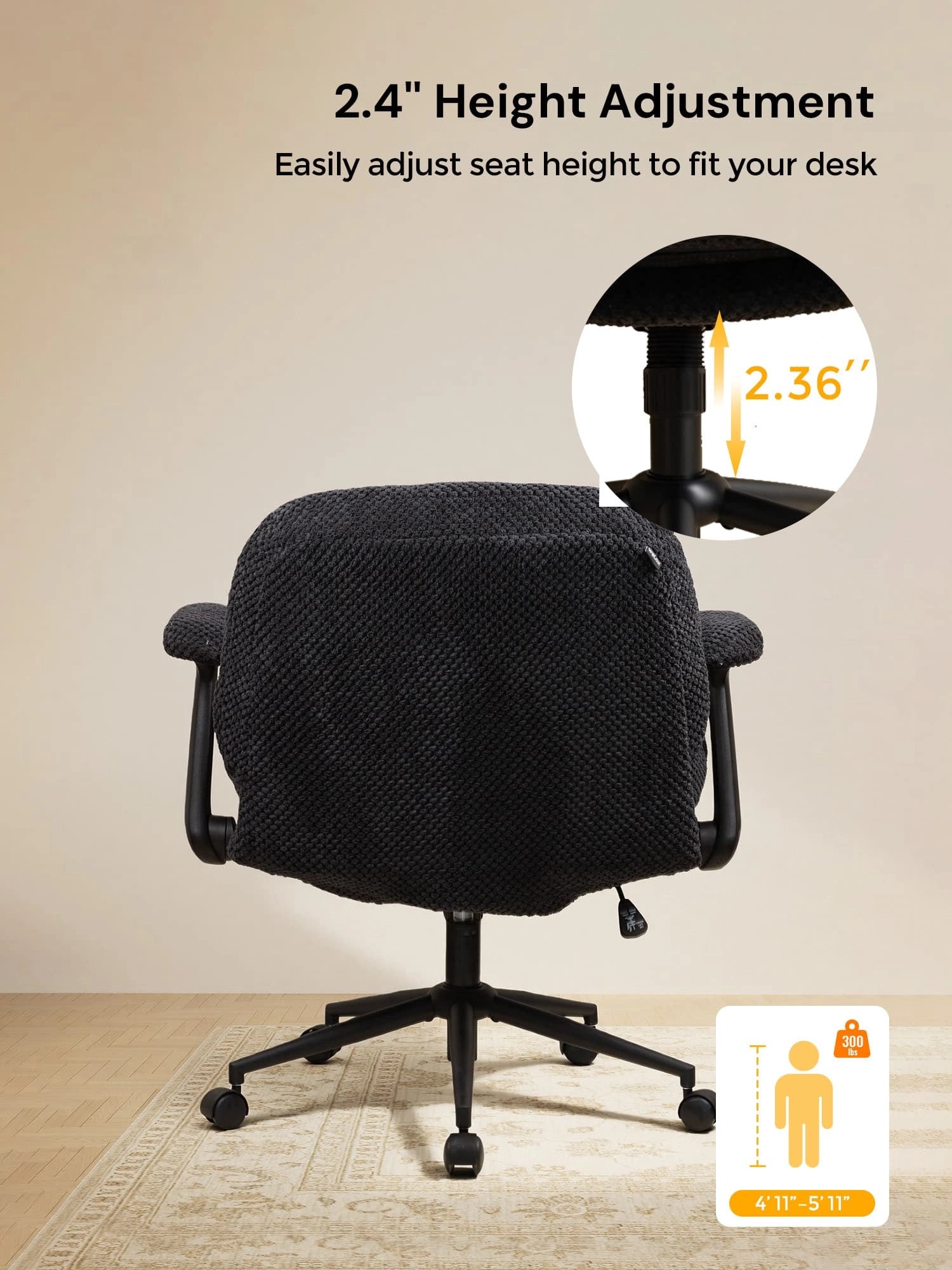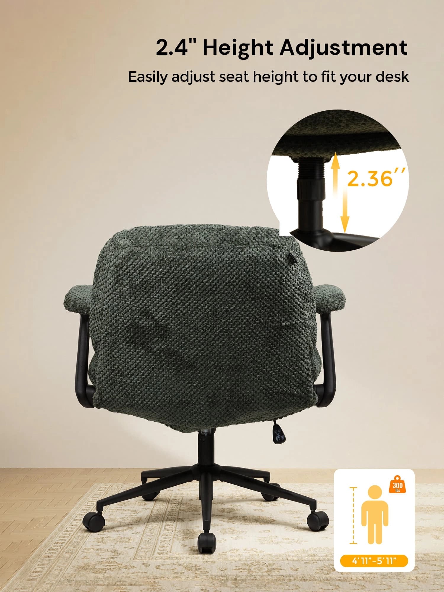- Adjustable Height – Seat height adjusts by 3.74” to fit different needs and setups.